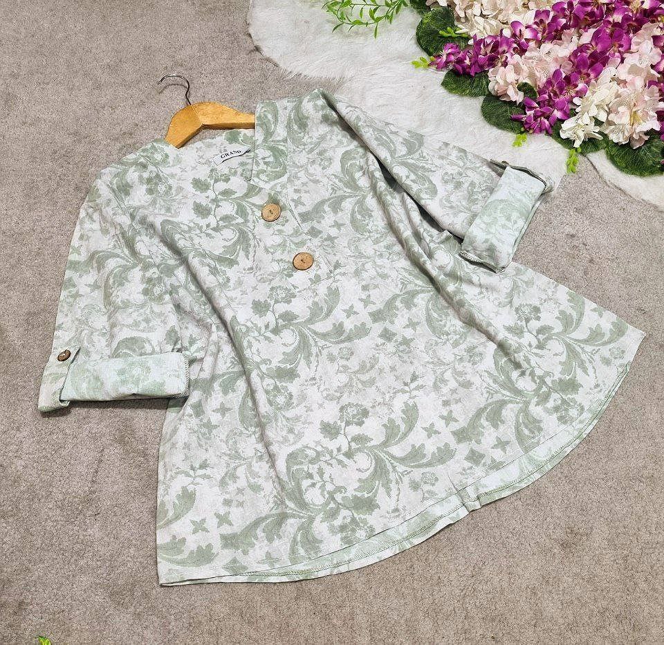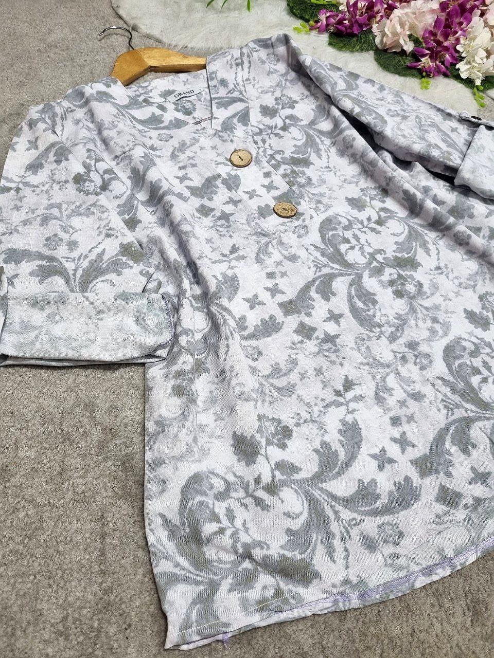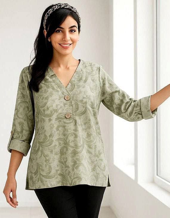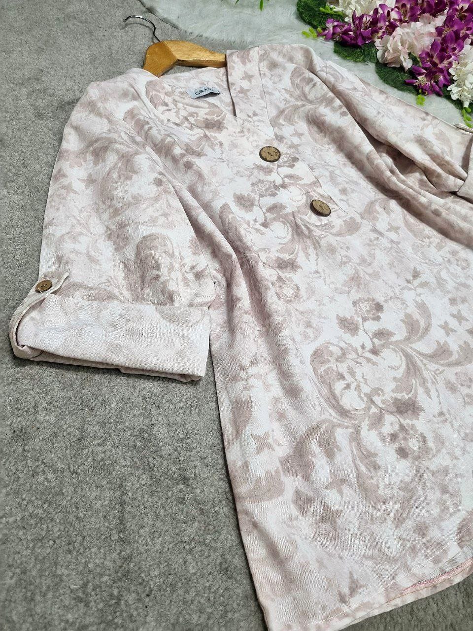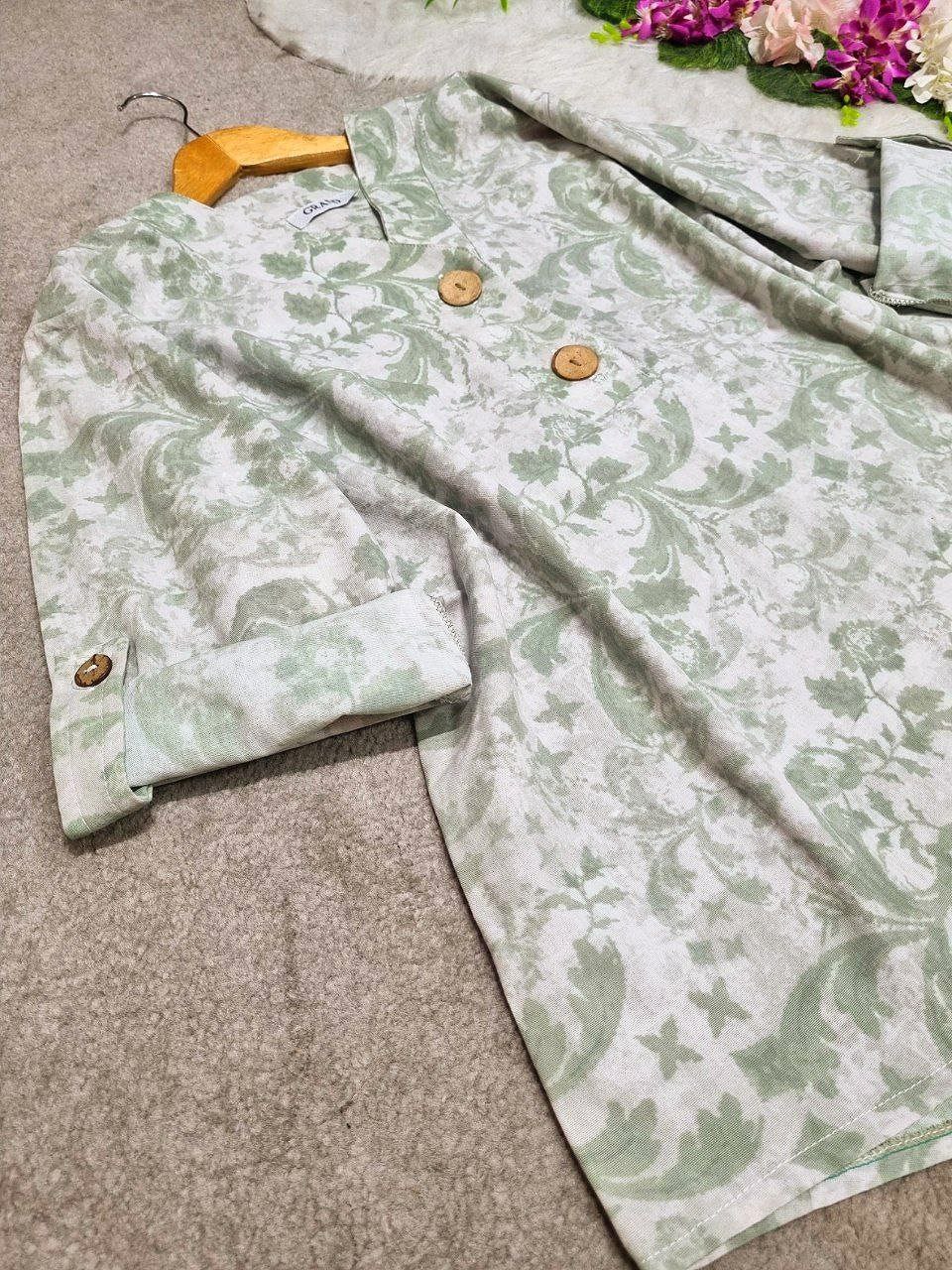 شناسه: #43587👚 نام: شومیز پریماه👗 قد جلو 68 پشت 70دورسینه 118استین از کنار یقه 61بازو 46دکمه ها کاربردی👌استین ها با دکمه بسته میشه🧵 جنس: لنین چاپی🖌 رنگ بندی: سبز - طوسی - نسکافه⚜️ سایز ها: فری36تا46💰 قیمت : ۵۴۸۰۰۰ تومان